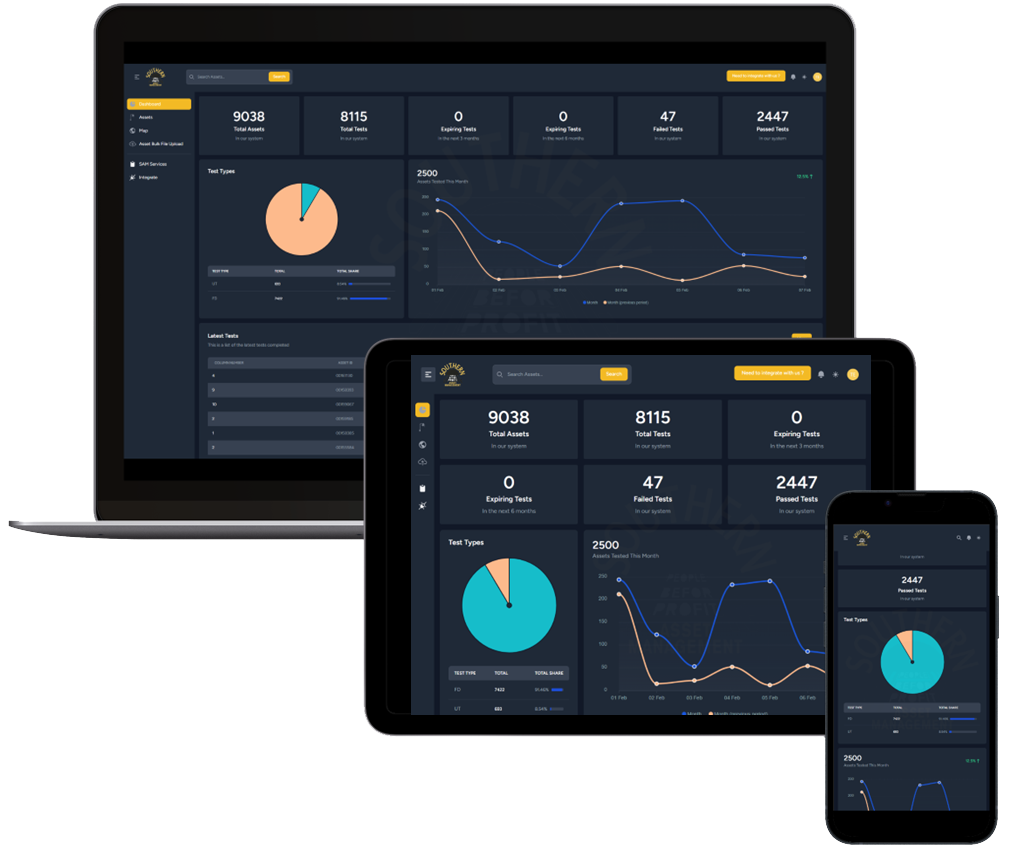 Your asset data summarized in reports. From the dashboard get quick statistics and data overview. Live updating reports shows assets and their tests in real time. Keep up to date at all times on how your testing is progressing.